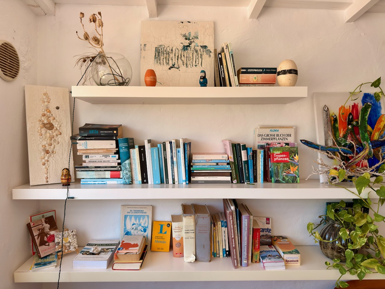 Gemütlicher Wohnraum mit Sofas, Bibliothek, Esstisch