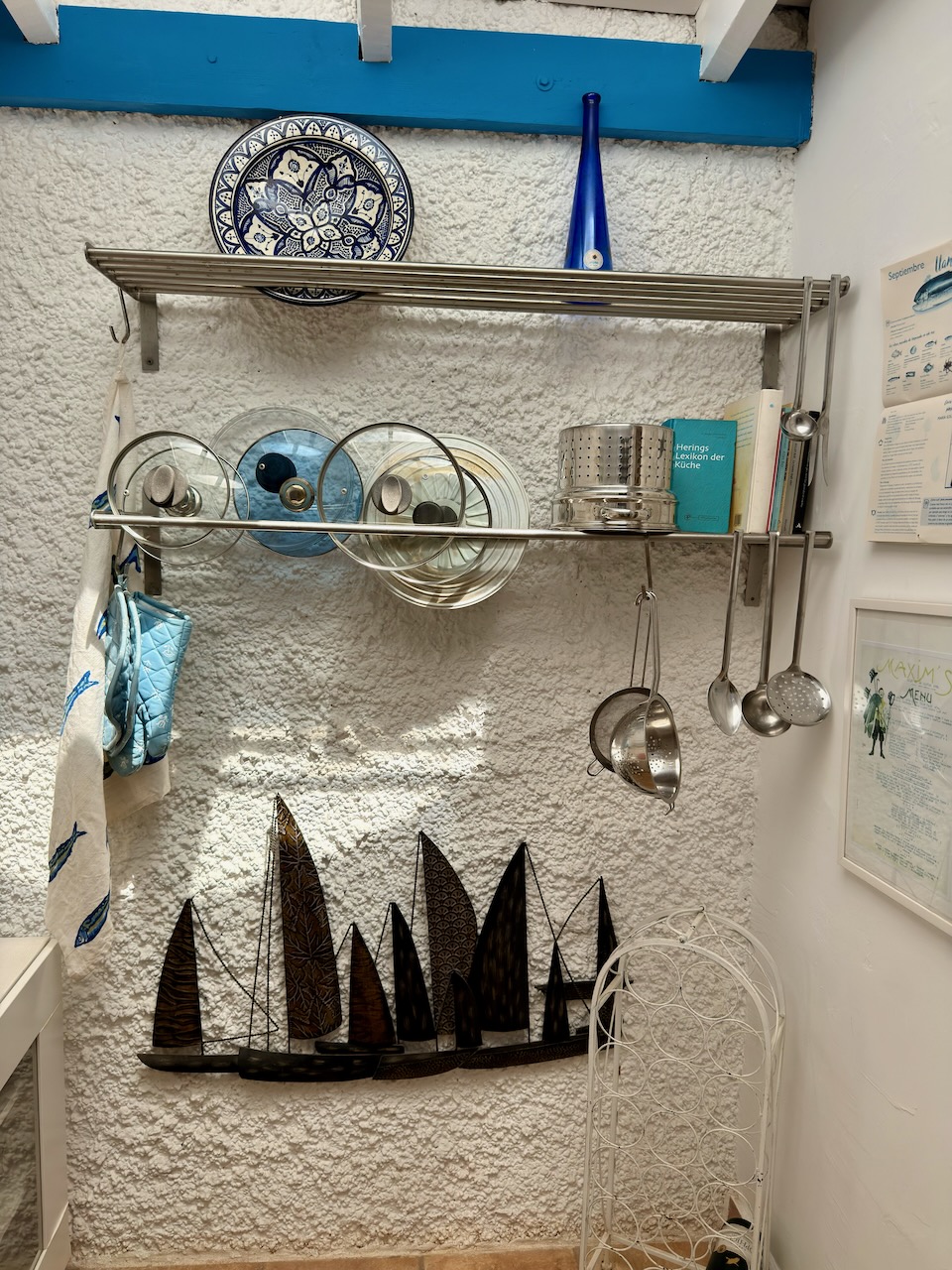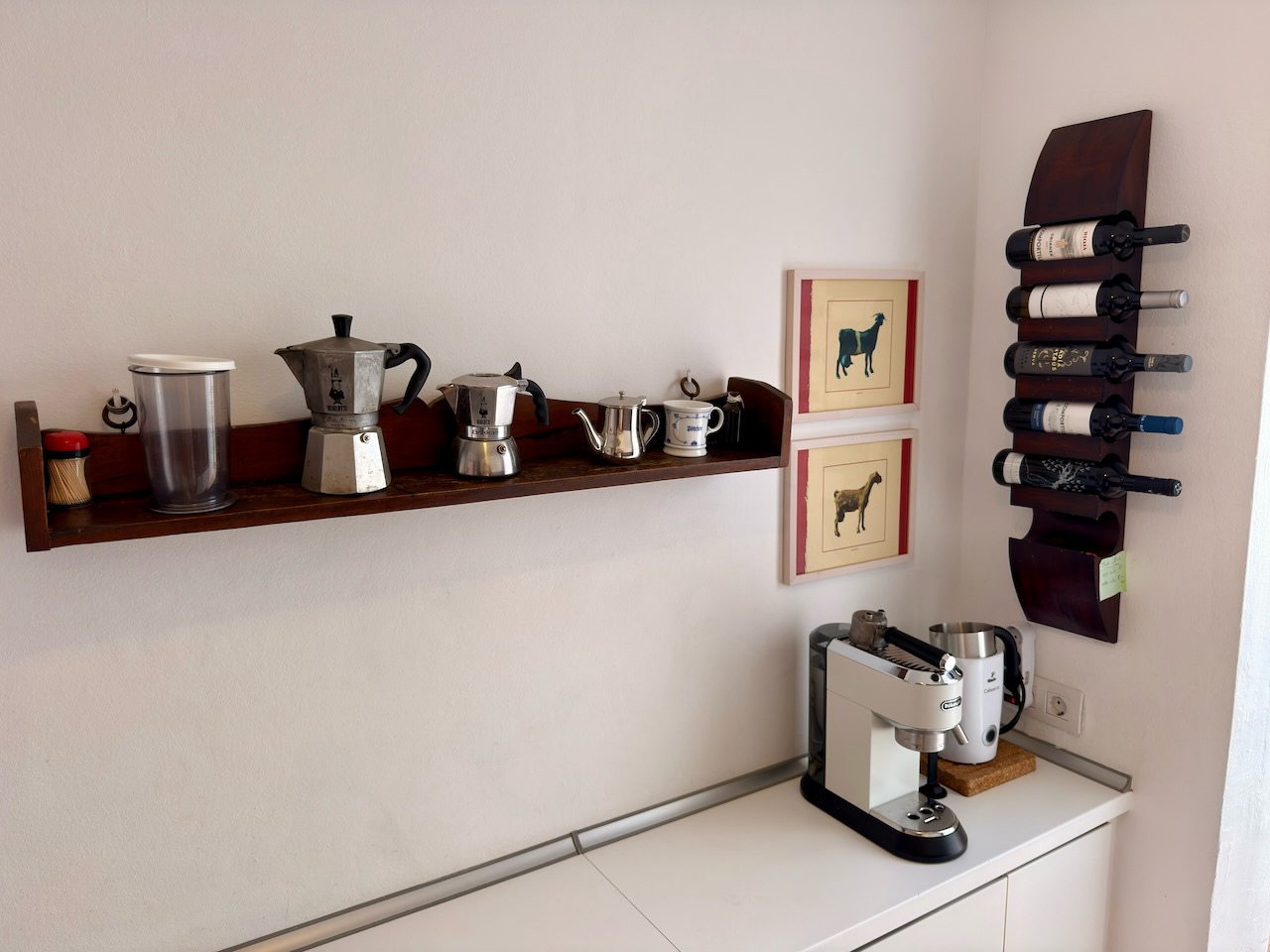 Komplett ausgestattete Küche mit großem Kühlschrank, Gefrierfach, Backofen, Mikrowelle, Kaffekocher und Milchschäumer